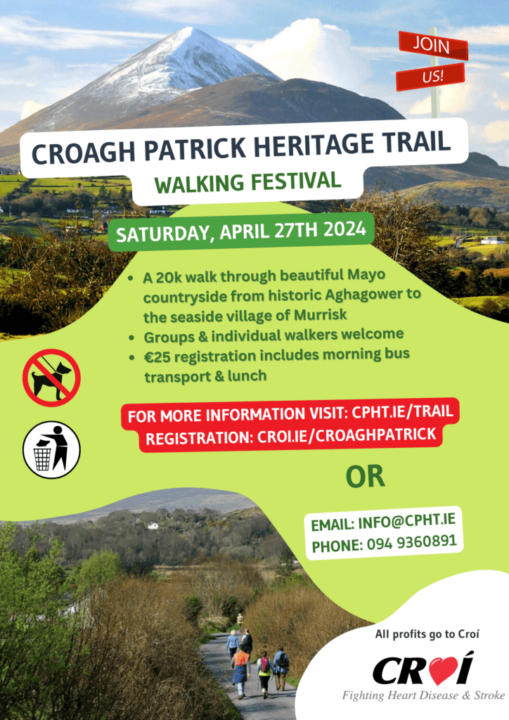 The Croagh Patrick Heritage Trail Festival will take place on Saturday, April 27th in aid of Croí Heart and Stroke. The festival will include a one day guided or self-guided walk along the final section of the Croagh Patrick Heritage Trail, from Aghagower to Murrisk, a distance of 20 kilometres. The registration cost is €25.