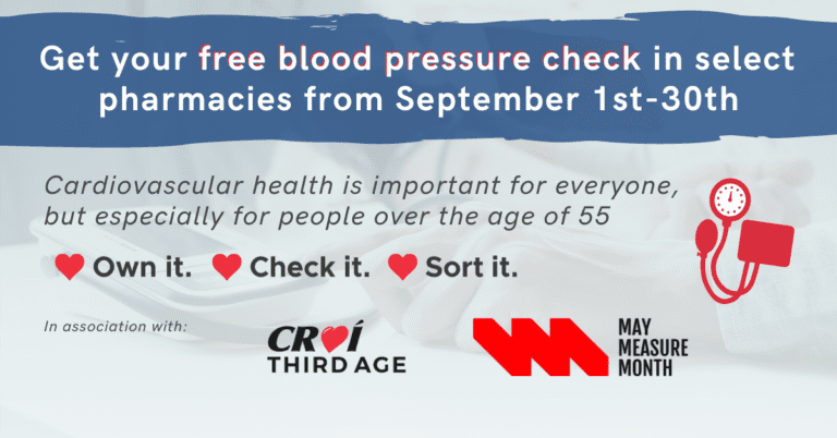 Did you know that uncontrolled high blood pressure can increase your risk of heart disease and stroke? The Croí Third Age programme, which aims to promote healthy cardiovascular ageing, is delighted to partner with local pharmacies across Mayo and Roscommon for the month of September, which is World Heart Month, to offer free blood pressure checks to anyone who has not had their blood pressure checked in the past year, with a particular focus on those over 55 years of age.