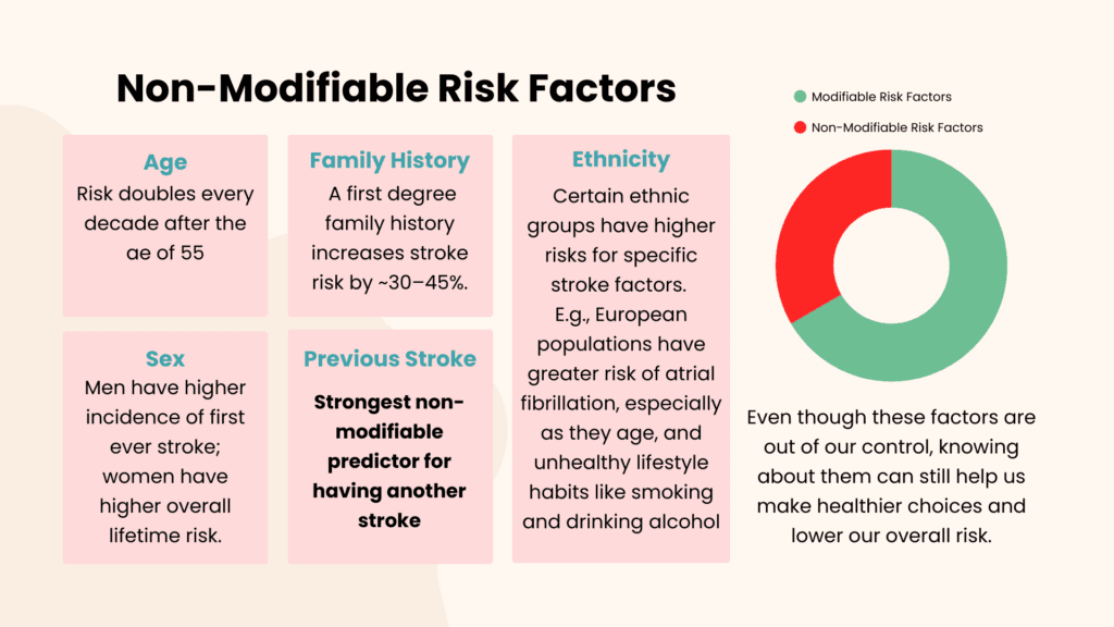 - Ethnicity: People of African descent may be at a higher risk, especially for hemorrhagic strokes, due to higher rates of hypertension in this demographic